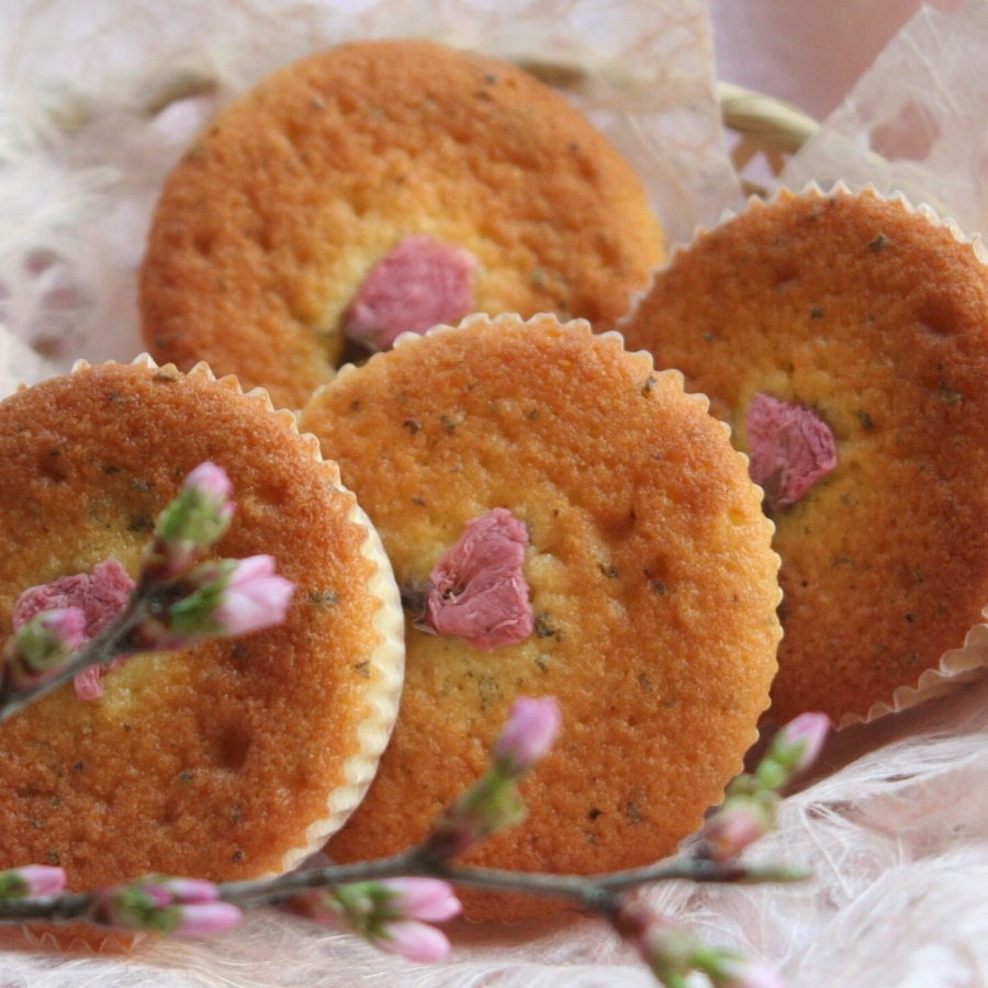 桜葉を練り込んだマドレーヌに、桜の花の塩漬けをのせました。