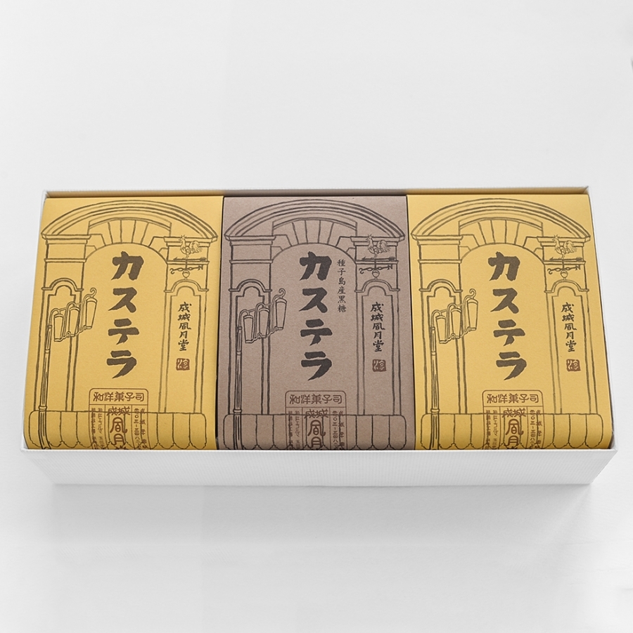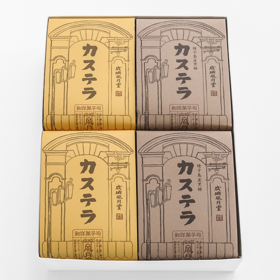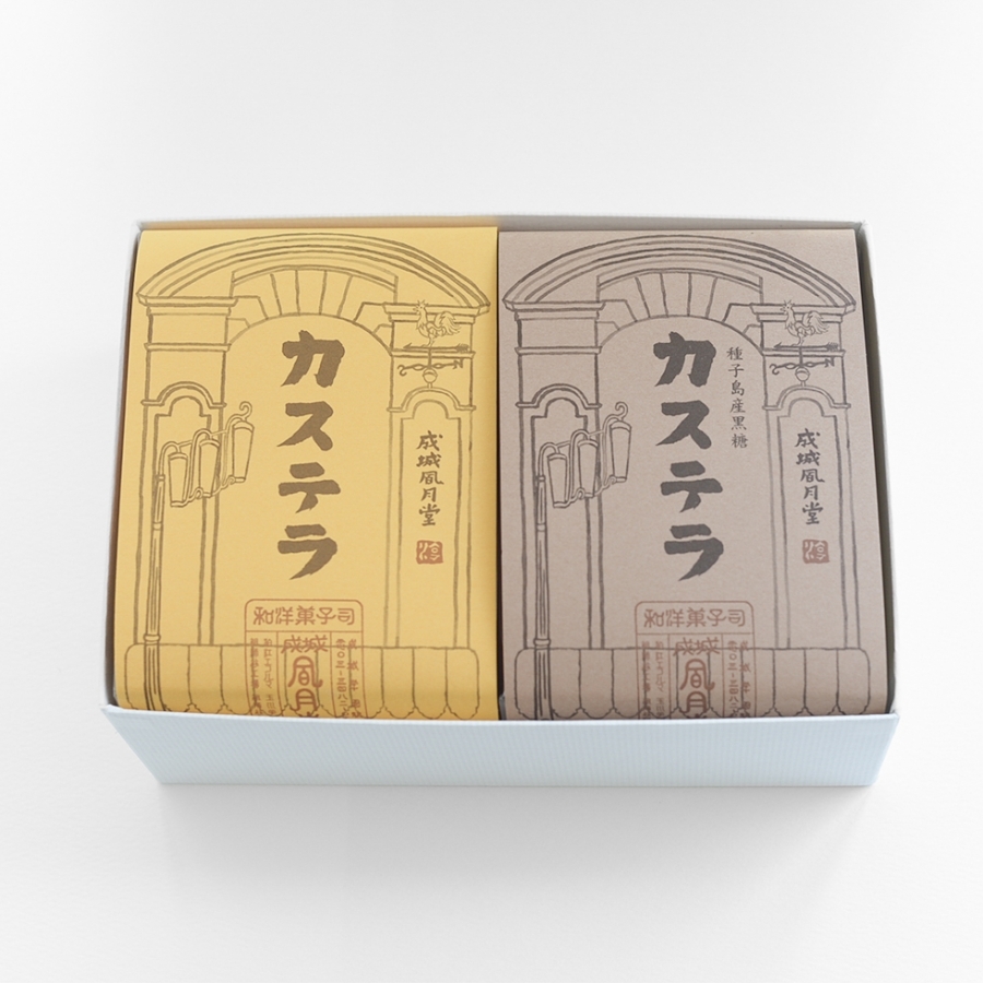 熟練の職人が手作業で焼き上げる、自慢のカステラです。ベーシックなプレーンと、種子島産黒糖風味の2種類を詰合せ。