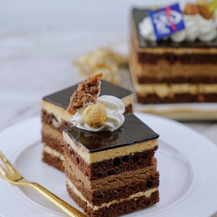 アーモンドたっぷりのココアスポンジにヘーゼルナッツのプラリネを混ぜ込んだ美味しいバタークリームと純生チョコクリームで何層にも重ねた昔ながらと新しいの融合したチョコレートケーキです。