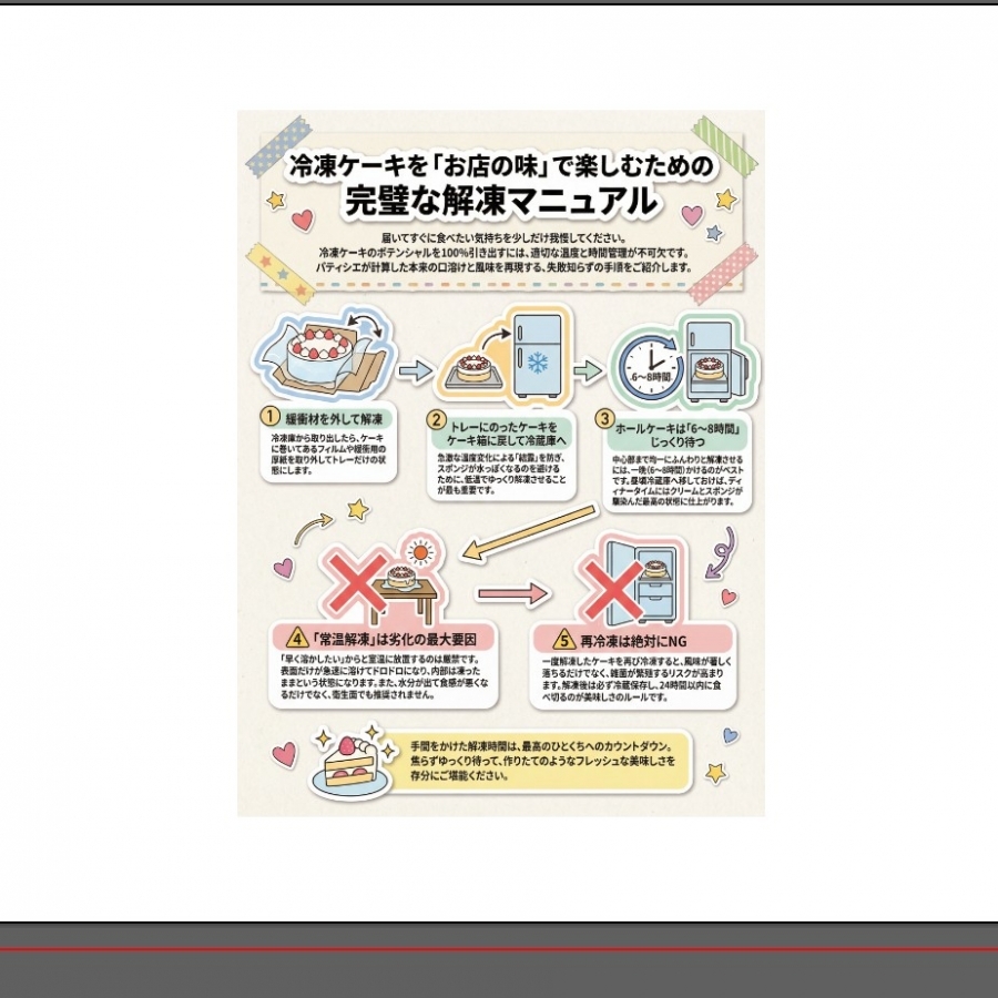 解凍時には箱を開け、中のフィルムから取り出してから冷蔵庫にて6〜8時間の解凍後はお早めにお召し上がりください。