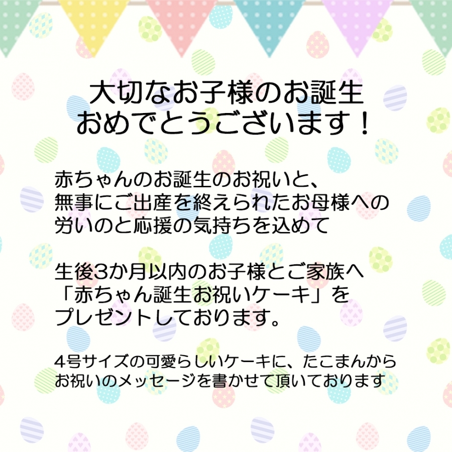 ◆たこまんからのお祝いのメッセージプレートをお付けしております(内容たこまん指定。内容の変更はできません)。ご希望のメッセージがおありの場合はメッセージプレート追加(1枚税込150円)にて承っております。ご希望のお客様はその旨を「お店への連絡」欄へお書きくださいませ。