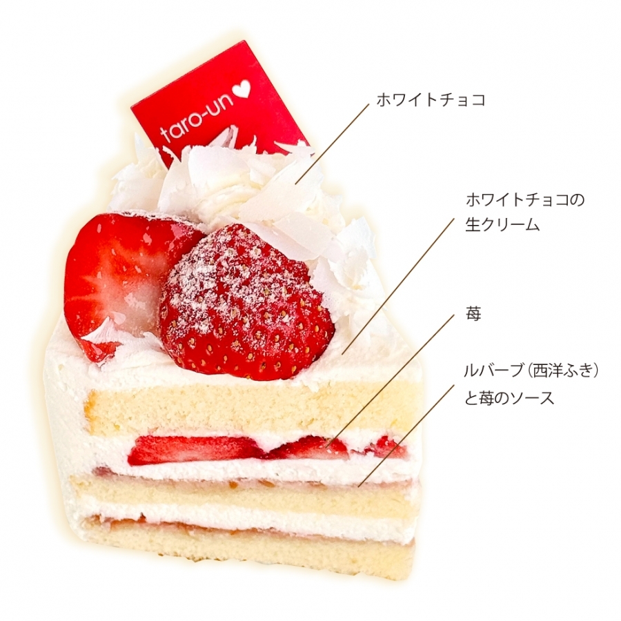 ルバーブ(西洋ふき)と苺のソースを塗ったスポンジに、ホワイトチョコの生クリームと苺をサンドした季節限定ショートケーキ。