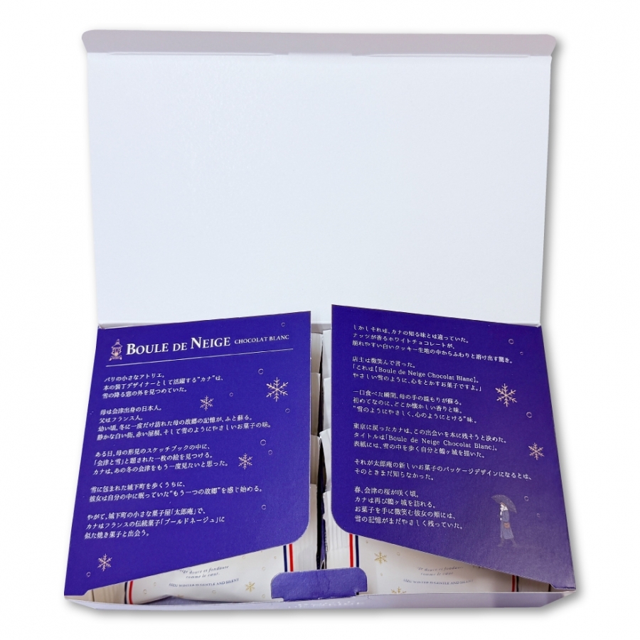 「これは【Boule de Neige Chocolat Blanc】。やさしい雪のように、心をとかすお菓子ですよ。」