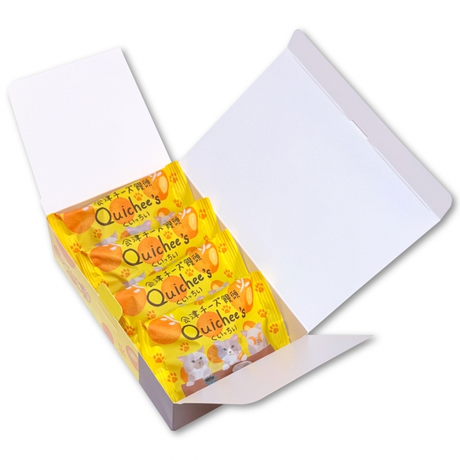 パッケージデザインを依頼したところ【会津チーズ饅頭 くいっちぃ】に猫のイラストをあしらった鈴木さんの作品がとても斬新で今までにない発想だったので採用させていただくことにいたしました。