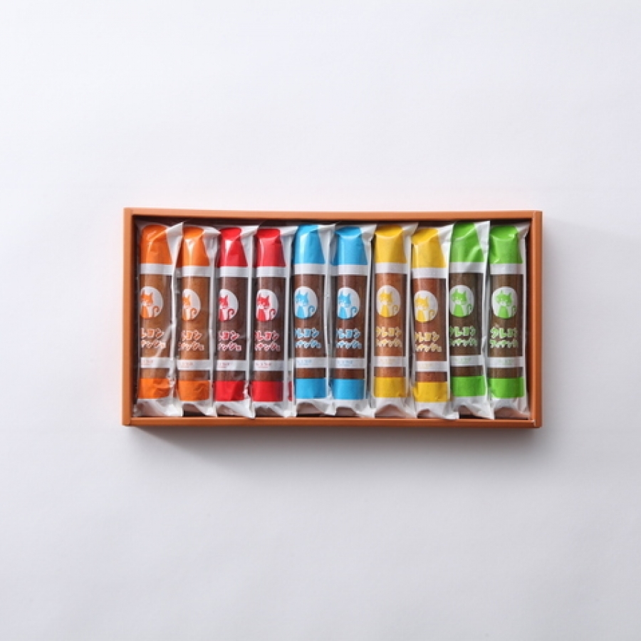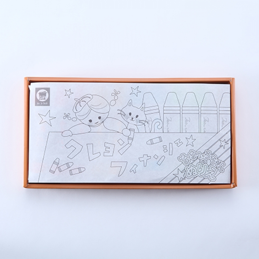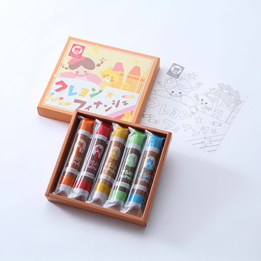 入学や入園のタイミングでクレヨンをもらった幼い記憶、色とりどりの配色に広がる世界。ティコラッテではあの時の記憶を(オレンジ、プレーン、ショコラ、紅茶、抹茶)5色のクレヨンフィナンシェとして蘇らせてみようと思いました。懐かしの箱を開け、思う存分に心のキャンバスに美味しさを描いてください。小さなお子様へのプレゼントにも最適です(塗り絵付き)