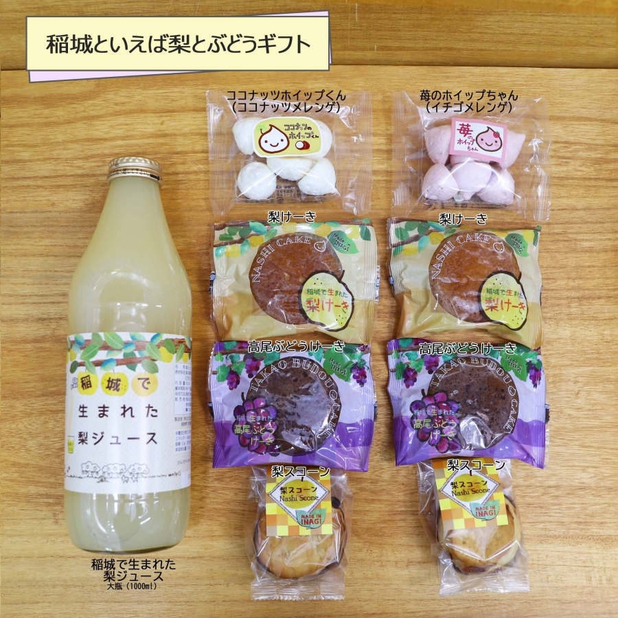 梨ジュース大瓶(1000ml)1本・梨けーき2個・高尾ぶどうけーき2個・梨スコーン2個・ココナッツホイップくん(ココナッツメレンゲ)1個・苺のホイップちゃん(イチゴメレンゲ)1点