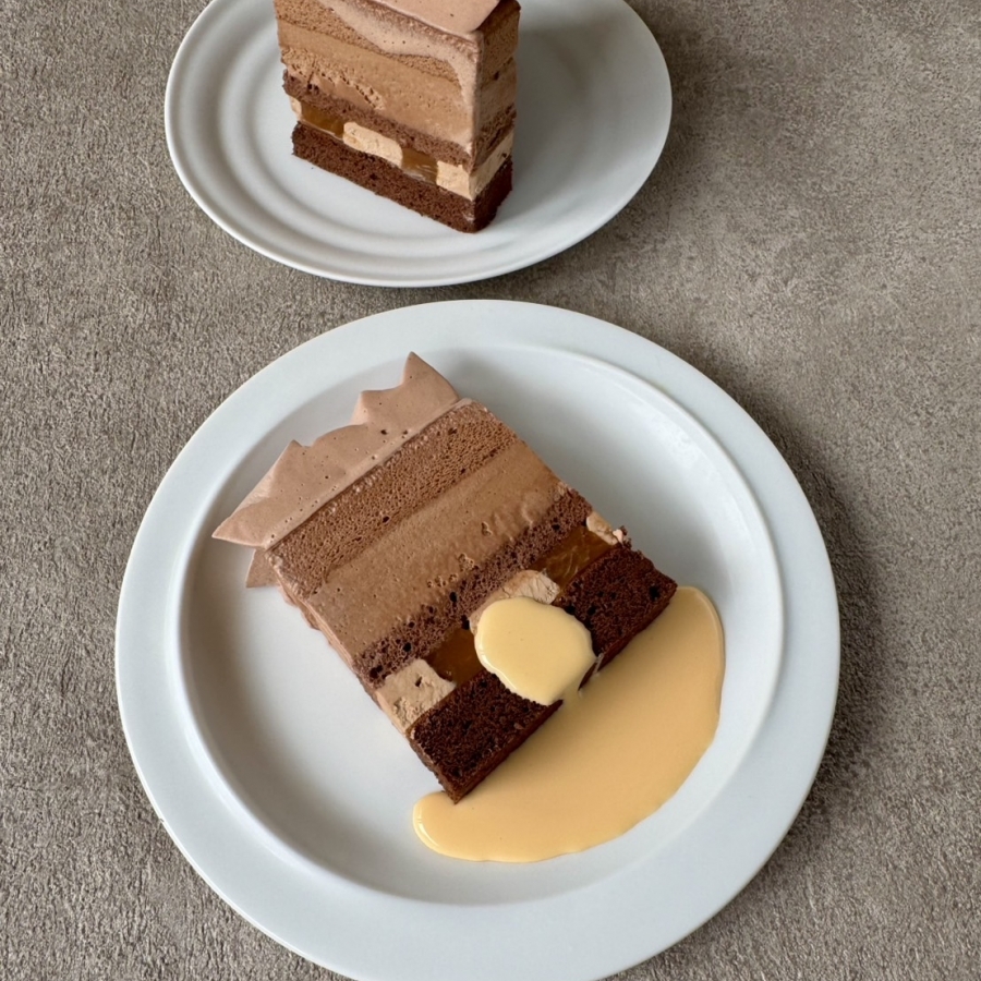 3種類のショコラスポンジ、3種類のショコラクリームを重ねた、6層のチョコレートづくしのケーキ。塩キャラメルソースが忍ばせてあり、贅沢な味わいです。